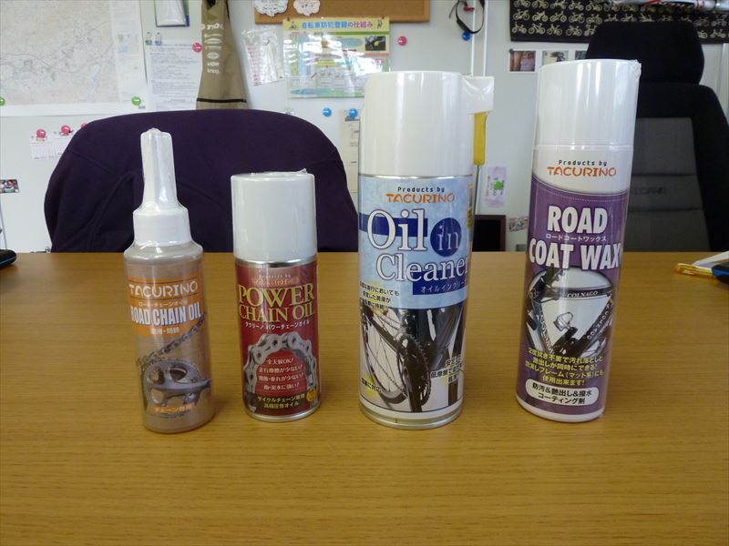 左から2番目はパワーチェーンオイル こちらも抵抗の少ないオイルですが、ロードチェーンオイルより長期にわたり効果が持続するようにしたオイルです。スプレータイプです。