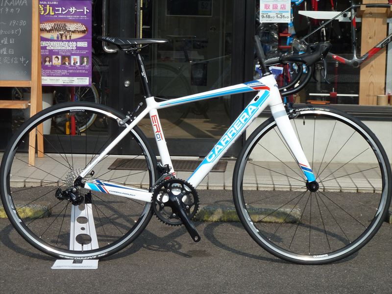 Carreraの2017モデルER-01です。フレーム価格98.000円という驚きの価格なのですが、これに旧SORAやFizikのサドルRitcheyのハンドルやステムシートポストなどを組み付けて参考価格195.000円を160.000円で。フレームサイズは460mm 160cm~170cmの身長ぐらいの方に合う感じでしょうか。この部品セットは1台きりですが、お持ちの自転車の組換えも承ります。その場合フレーム価格は98.000円ですが組換え工賃15.000円をサービスさせて頂きます。(尚、組換えに伴う交換部品代は含まれておりません。)