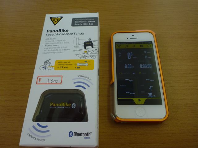 センサーのとなりのiPhoneは私物ですが、PanoBikeって言うアプリ(アンドロイドも対応)を入れればサイクルコンピューターになってしまうという事です。(実はこのアプリを入れるだけでスピードは出ます。)