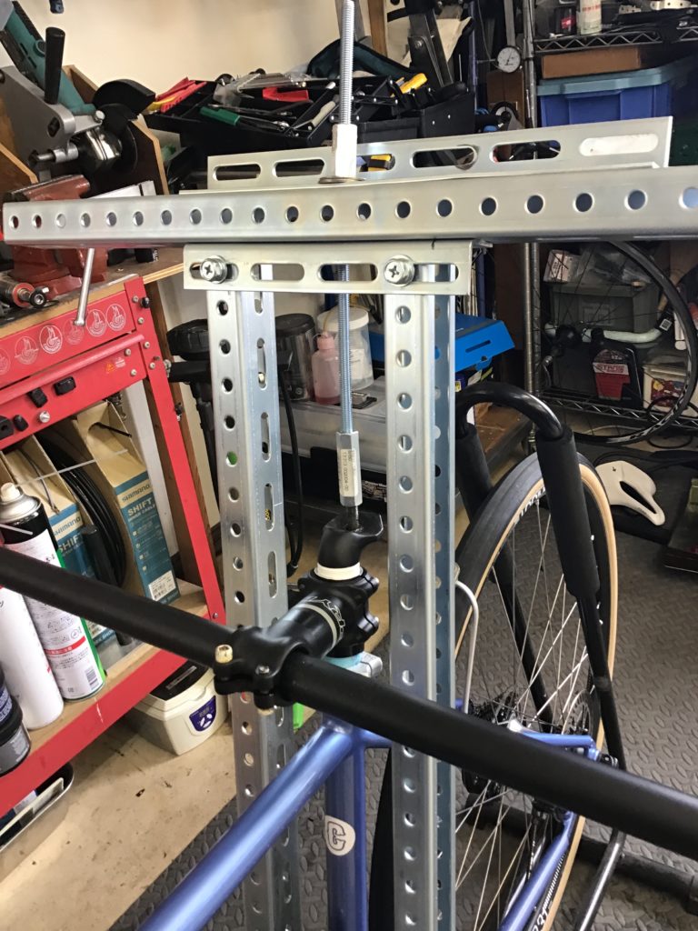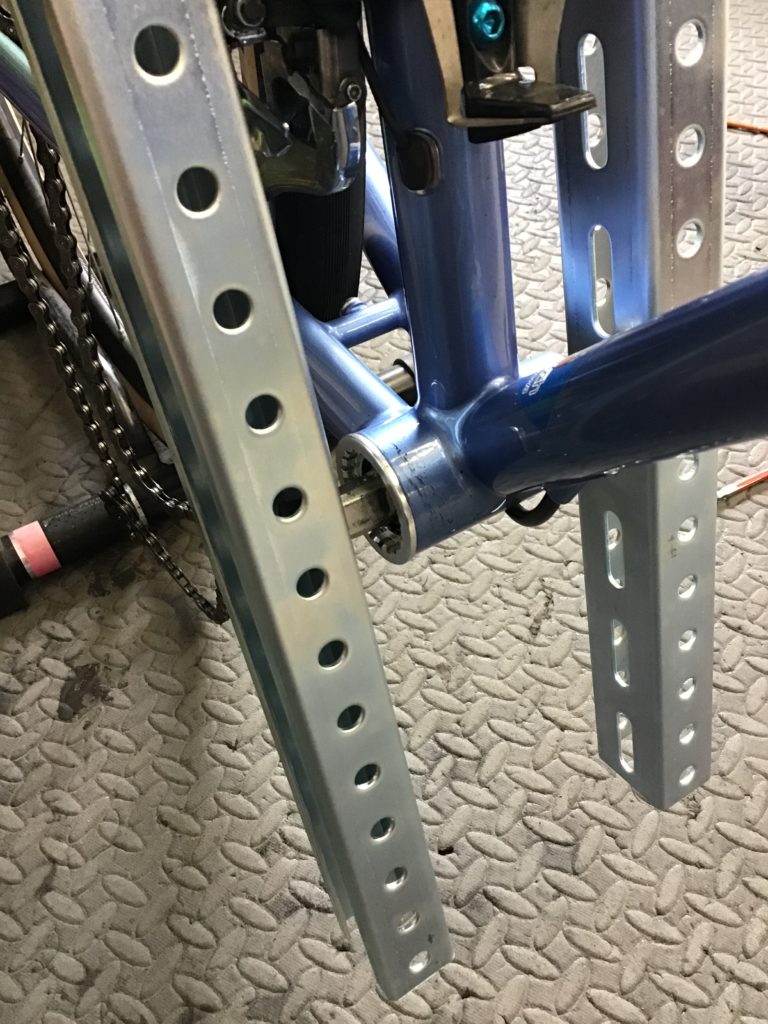 角アングルの上側をブリッジして そのブリッジとシートポストを固定(1本止めのシートポストでしたので長い各ナットで、シートポストのクランプボルトとずん切りボルトを固定。アングル材の上側のナットを締めることで、シートポストを抜く方向に引き上げるのですが。締め上げると、アングル材はあっという間に変形します。という事で、アングル材の上に角アングルともう一つアングル材を載せて補強。これで締め上げていくと、M8のねじ山が潰れます。まーシートポストのオフセットの分斜めに引っ張っているのですが。