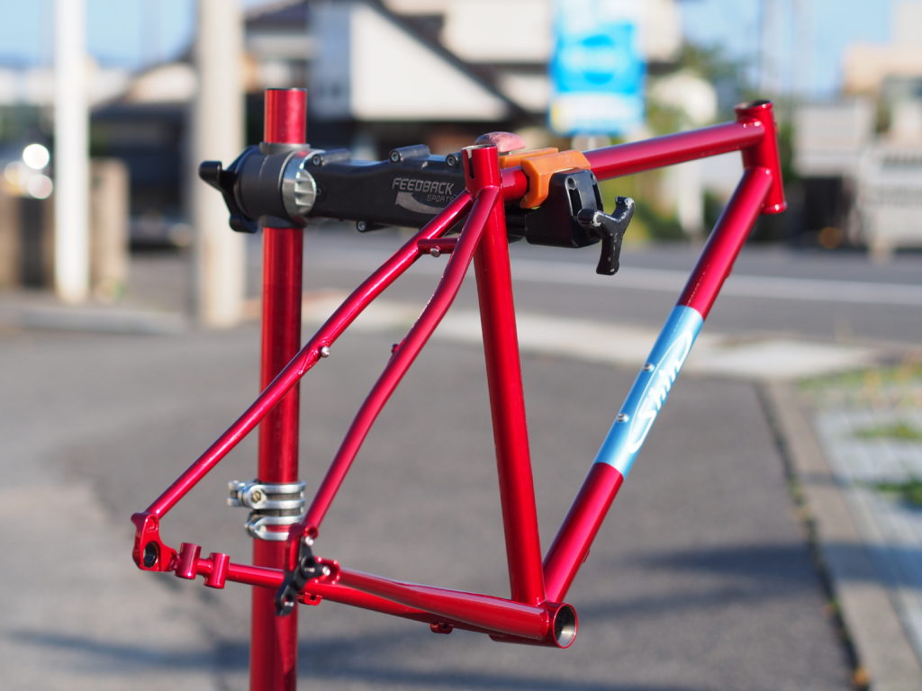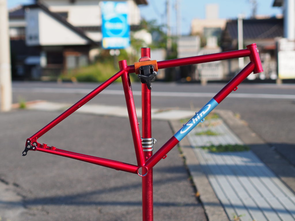 ちなみに軽量パイプで作って頂いたので、塗装込み写真の状態で1471gです。30万円ぐらいのカーボンロードのフレームが1200gぐらい(実は塗装無しとか付属品無しとか)ちょっと部品に軽い物をインストールすれば、まあまあ軽く出来上がるかなと。