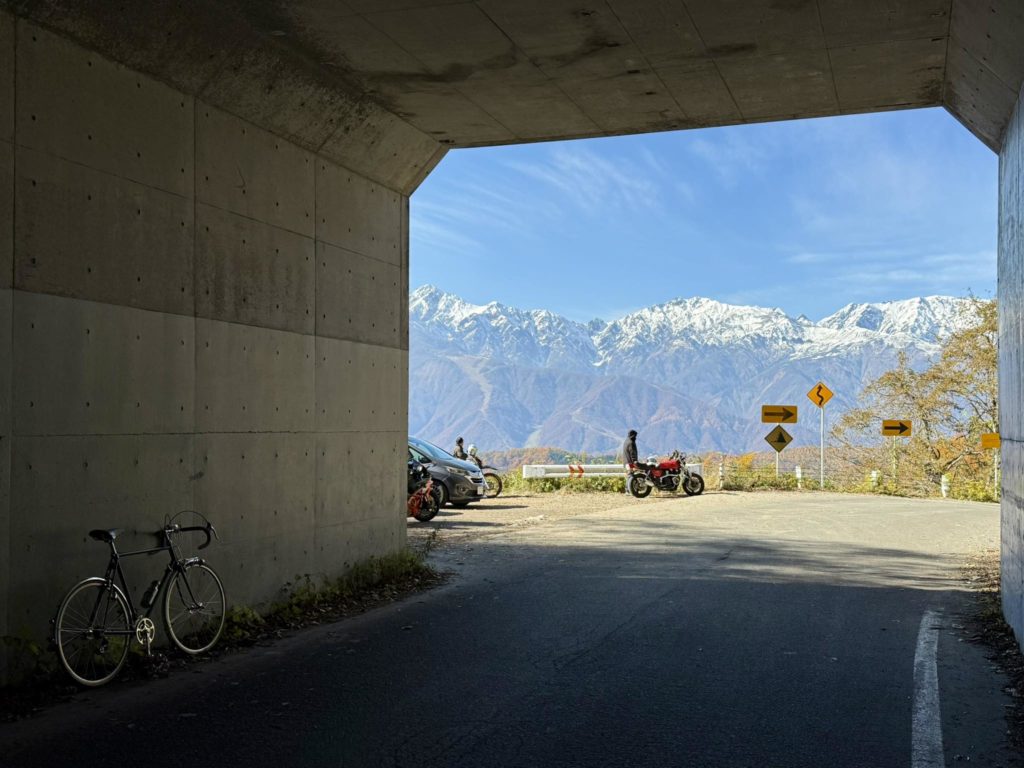 鬼無里村と白馬村の境にある嶺方峠を走ってこられました。うらやましい事に快晴!白馬の山々が降ったばかりの新雪に覆われてとてもきれいです。