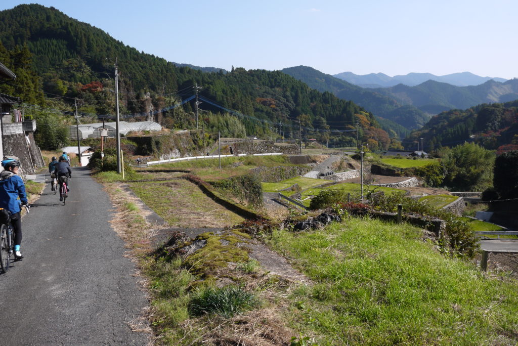 下っていくと竹地区の棚田 ここの棚田の石積はお城の様にきれいで圧巻でした。