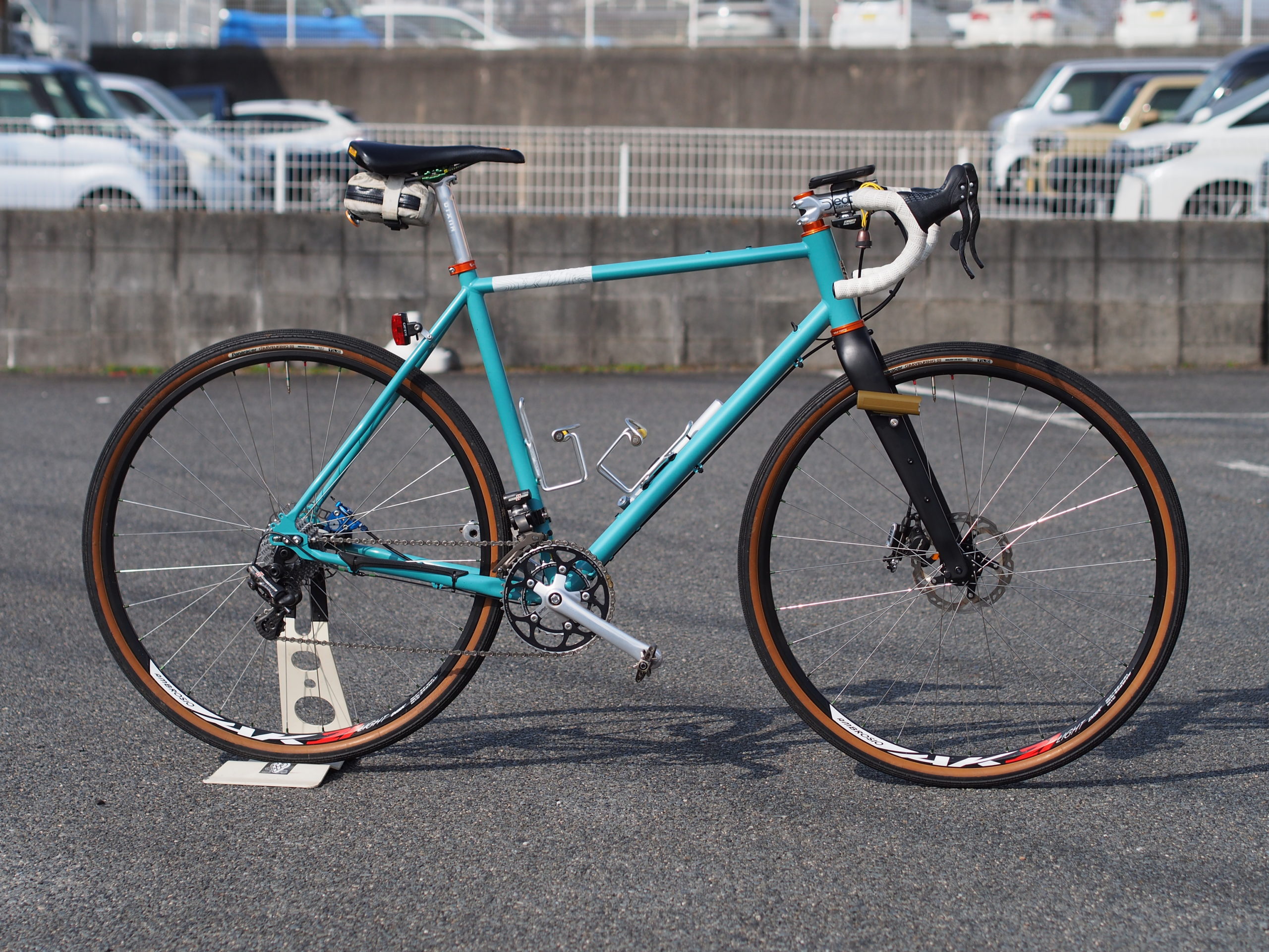 組んで乗ってみた感じとしては、予想以上にかかりが良いフレームなんです。要はグッっと踏んだ時にしっかりフレームが付いてきてくれる感じ。(はい、カーボンフレームと比べると全然です。スチールフレームの中ではです。)このぐらいの反応の良さだと、30Cぐらいのロードタイヤを履かせての舗装路ツーリングにも踏んだら走る感があって良いだろうなと思います。持ち上げると重いですが(ペダルとボトルケージが付いた状態で、9.9kgでした。完成車のカタログ重量は、ペダル抜きですし、ボトルケージ他も付いていない重量なので、そういう基準で計ると9.5Kgぐらいになるのかなと思います。他社さんのカタログ見てもらったらわかるのですが、グラベルロードの完成車で50万円ぐらいの物って案外重いです。普通に9kg台です。)走って軽くて、しなやかさも併せ持っていていろいろな用途に使える、悪くないフレームだと思います。特に1台目にロードバイクを買われて、メインはツーリングなんだけどいろいろな遊び方をしてみたいっていう方にはピッタリなんじゃないかと思います。